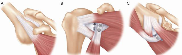 Viene utilizzato un approccio anteriore con incisione delto-pettorale per esporre il processo coracoideo. Il legamento coraco-acromiale e l’inserzione distale del piccolo pettorale vengono liberati dall’aggancio sulla coracoide, mentre le origini del muscolo coraco-brachiale e del capo breve del bicipite rimangono intatte. Il processo coracoideo è osteotomizzato al suo “ginocchio”, producendo così un innesto osseo di circa 1,5 cm di lunghezza. Si fa molta attenzione per evitare danni ai tessuti molli e al nervo muscolocutaneo nella zona circostante.